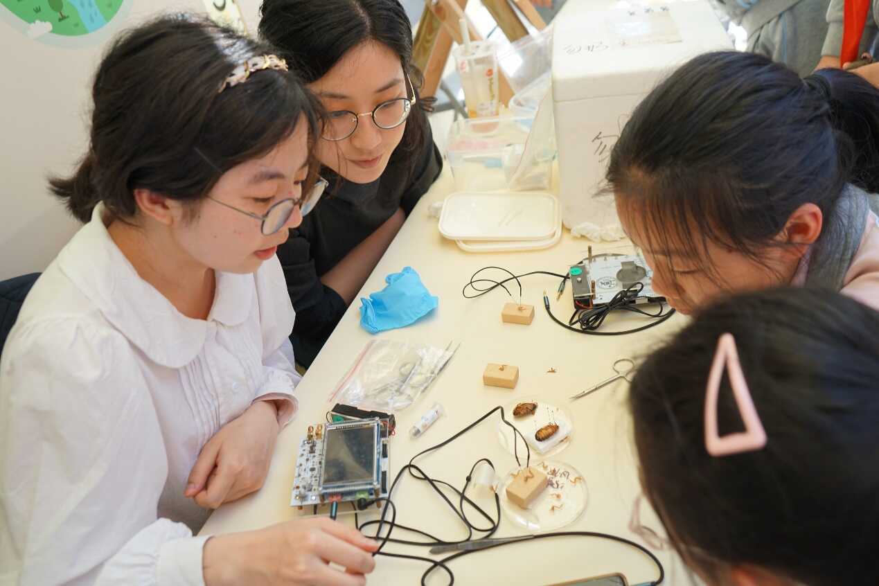 開幕式上,兩名小朋友做代表上臺體驗“腦功能水平測試”,通過標準化、定量化指標,自主化檢測大腦的記憶、注意力等各項大腦功能。在發光的肌肉展臺,小朋友們都想看看自己的肌肉是不是夠強大,紛紛戴上信號采集系統,揮舞手臂,讓“云朵”發出不同顏色的光。在腦電對抗展臺,小朋友們試圖通過背誦或做算術,增強自己的腦電波,來體現自己的專注力高人一等。當孩子們看到已經死亡三小時的蟑螂腿還能隨著音樂有節奏地“跳舞”時,發出了陣陣驚呼聲!