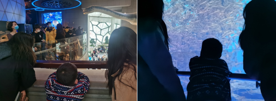 活動中,志愿者們帶著孩子們走進了上海自然博物館。從宇宙起源到物種演化,琳瑯滿目的精彩展品讓孩子們睜大了眼睛。大家搭上時光列車,依次前往感受137億年前的宇宙大爆炸的壯觀場面和地球形成之后的生命奇跡。寒武紀的古特提斯海藍色的海水照亮了孩子們臉上的好奇。
