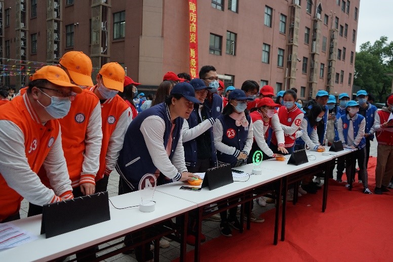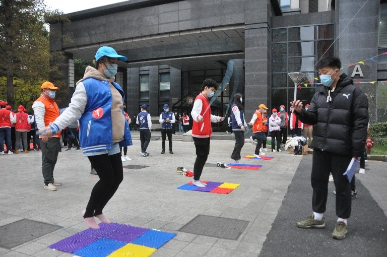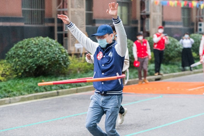 此次運動會分兩個環節,第一環節為頗具挑戰的“紅色知識”搶答環節,題目聚焦黨的二十大報告的主要內容,參賽代表每每搶答成功時,團隊就會全員呼喚雀躍。第二個趣味運動環節,特邀上海體育學院專業人員擔任裁判,團隊成員分工依次完成指壓板跳繩、俯臥撐、踢毽子、瑜伽磚十米過河、呼啦圈十米前進。在兩個多小時的活動中,運動員奮勇爭先,樂在其中;裁判員客觀認真,公正裁決;工作人員盡心盡力,熱情服務。活動中,加油聲與歡笑聲灑滿整個賽場。