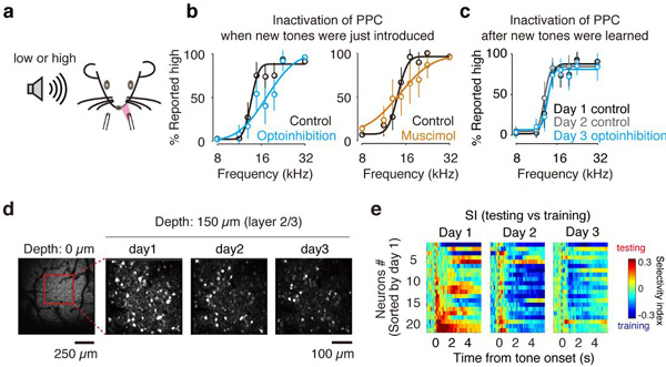 從這個思路出發,團隊精心設計了一系列巧妙的實驗。同以往研究將所有刺激同時進行行為訓練的方法不同,該團隊首先僅用少數感覺刺激(兩個聲音刺激,低頻和高頻)對小鼠進行行為訓練。當小鼠學會將這兩個聲音與對應的選擇關聯之后,才加入介于這兩個頻率之間的聲音作為新刺激來測試小鼠的分類抉擇能力。行為學實驗結果表明,即使從未聽過這些新的聲音,實驗小鼠也能夠通過之前學會的高頻、低頻分類規則對新聲音刺激做出恰當的判斷。這時團隊利用光遺傳等神經操控技術抑制PPC活動,發現實驗小鼠對新刺激的選擇判斷會顯著受損。這些結果直接支持PPC在對新刺激進行抉擇的過程中發揮了重要作用。然而,當新刺激經過幾天訓練之后,再對PPC進行抑制時,實驗小鼠的選擇判斷不再受影響,表明感覺刺激經過學習,已經形成類別與行動之間的關聯后,不再需要PPC參與。這些結果直接支持了團隊提出的新假說。